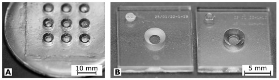 A 2PP system (Photonic Professional GT, Nanoscribe GmbH, Eggenstein-Leopoldshafen, Germany) equipped with a 20× objective (NA = 0.5, Zeiss, Jena, Germany) was used to locally cross-link the HES-MA. For printing inside the cwMBR, the precursor solution was directly filled into the cwMBR and then covered with a microscope cover glass (thickness 170 ) as shown in Figure A1A. For initial studies, the cwMBR volumes were replaced by fs-laser-drilled holes in either 700 or 170 thick glass to provide optical paths through the precursor solution of different length. The reservoirs were closed with microscope cover glasses on which the structures were printed.