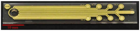 In Figure 3, photographs of cwMBRs manufactured by molding and by ablation are shown. Both manufacturing methods resulted in transparent systems. The systems made out of glassomer®(Glassomer GmbH) exhibit some waviness and small grooves. The waviness can be explained by the use of the very soft PDMS master. The grooves can be explained by particles on the PDMS, which quickly contaminate the master’s sticky surface. cwMBRs made by molding exhibit a roughness of = . cwMBRs made by ablation initially exhibit a roughness of measured by laser scanning microscopy (VK-X260K, Keyence, Osaka, Japan) which could be lowered to by thermal annealing. Even though the glass molding technology can generate complex structures in one process, the obtained surface quality and planarity did not meet the requirements for lithographic electrode fabrication. Therefore, ablation and bonding were used to manufacture cwMBRs equipped with microelectrodes for biomass sensing. Seven cwMBR-systems with biomass sensing electrodes () as shown in Figure 4 could be located on one 4 –inch wafer. Four contacts were addressing the MES, four contacts were addressing the RES and one contact to ground was shielding the conductive paths.