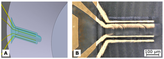 Layers of chromium (resulting in 8 nm on planar surface) and gold (resulting in 250 on planar surface) were sputtered (LS 440 S, Ardenne Anlagentechnik GmbH, Dresden, Germany) onto the finished cwMBRs before the resist (Intervia 3D-N, Rohm and Haas, Philadelphia, PA, USA) was electrodeposited at a voltage of 105 at 26 °C and dried under vacuum for 3 . The resist was then exposed in two steps. First, the electrodes inside the cwMBRs on angled sidewalls were exposed using a laser microstructuring workstation (microSTRUCT C, 3D Micromac AG, Chemnitz, Germany) equipped with a femtosecond laser (Pharos, Light Conversion, Vilnius, Lithuania) at 343 with a power of 1 at a writing speed of 24 −1. As a next step, the patterns of electric supply paths with contact pads were exposed on the planar surface using a mask aligner (EVG® 620, EV Group, St. Florian am Inn, Germany) at a dose of −2. The resist was developed (InterVia 3D-N Developer, Rohm and Haas, Philadelphia, PA, USA) before the metallic coating was etched in aqueous iodine–potassium iodide solution and subsequently in an alkaline chromium-etching solution. Next, the remaining photoresist was stripped with acetone. For passivation of the electrical leads, SU-8 (SU-8 2050, MicroChem Corporation, Newton, MA, USA) was spin-coated on the wafer. Inhomogenities of resist thickness caused by the cwMBRs recesses did not disturb lithographic patterning according to the manufacturer’s specifications. Subsequently, the wafer was divided into individual cwMBR systems, each measuring 10 mm 60 mm, using a dicing saw (DAD 320, Disco, Tokyo, Japan). Following this, the hydrogel was printed into the separated cwMBRs, as detailed in Appendix A.1.