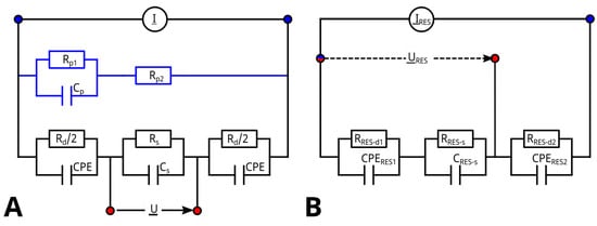 The ECM of the RES is shown in Figure 6B. It consists of similiar elements as the four-probe MES. The measured impedance includes the electrode impedance ( and ) as well as the resistance and capacity of the medium soaked into the hydrogel ( and ). It excludes the electrode impedance ( and ) of the counterelectrode. A parasitic path must not be considered when measuring the voltage resulting from the induced current in a three-point configuration.