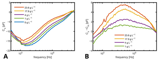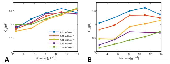 But it was found that determined using (2) based on measured impedance values as given in Figure 7A varied not only with concentrations of suspended yeast cells but also with frequencies even below MHz. The typical course of -dispersion (see also Figure 1) in yeast cells suggests a decreasing capacity between ≈ and ≈10 MHz [41], which is also found in the processed capacity up to the limit of the measurement range (5 MHz). This reveals that ideal four-point measurement conditions were not given due to a parasitic current, as indicated in Figure 6A and discussed in the literature [13]. To compensate for variations in the media and to better represent the -dispersion of the cells, the spectrum for obtained at 0 −1 () was subtracted from all other spectra (Figure 7B), and the capacity as obtained for MHz was used as a measure for biomass concentration, as shown in Figure 8.