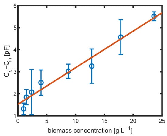 The linear fit is in good agreement with the measurement, but it does not cross the axis origin. This could be explained by the fact that only for the measurement without cells, the culture medium was fresh without any consumption by the cells. The linear fit has a slope of pF −1. Even smaller biomass concentrations below 5 −1 could be distinguished.