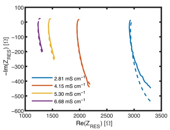 The measured current is not completely flowing between the inner electrodes, because a parallel parasitic current splits off, which is influenced by the polarization resistance , a parasitic double-layer capacitance and a parasitic medium resistance , as shown in Figure 6A. As a consequence, used to determine biomass is no longer independent of changes in the conductivity of the medium. To analyze the parasitic pat, impedance data obtained without cells were fitted assuming the ECM including the parasitic elements. In the Nyquist plot shown in Figure 9, impedance data and fit results are shown for different media conductivities. Table 1 lists values obtained for all the elements.