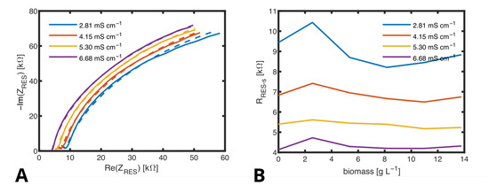 (A) Nyquist plots obtained from measurments with the RES in media with varied ionic concentrations and fitted curves (dashed lines). (B) , calculated by fitting several spectra measured in medium with biomass from 0 to −1 and conductivities from to −1.