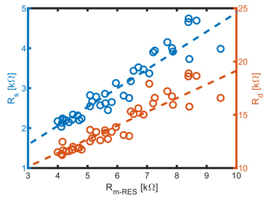 The EIS data were fitted based on a Matlab® (The MathWork Inc., Natick, MA, USA) script [39], which was edited to match the purpose of this work. The fitting of a given equivalent circuit model (ECM) to the EIS data is based on the build-in function of Matlab® fminsearch, looking for the minimum of the given problem, using the simplex method [40]. The original form of the script takes an ECM as input from the user and generates the transfer function from it. For this work, the transfer functions of the ECM for the RES and the MES were entered directly. In addition, the script was automated, and it processed several measurements in succession.