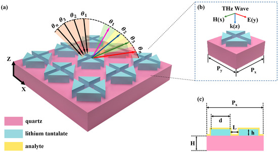 All-dielectric metasurface has been demonstrated as an alternative to traditional metallic metasurfaces. It is based on high-refractive-index dielectrics and leverages Mie-type resonances rather than surface plasmon resonances to obtain strong magnetic resonances as well as electric resonances, thereby enhancing the interaction between electromagnetic waves and materials [17,18,19]. This innovative design significantly reduces energy losses while elevating the quality factor (Q-factor) of the resonators, thus greatly improving detection sensitivity [17,20]. Furthermore, intrinsic heating can alter the local refractive index and potentially damage biomolecules. A dielectric metasurface can mitigate the plasmonic ohmic loss and heating issues, thereby enabling better repeatability and stability for biosensing [21]. Currently, a precise angle-scanning strategy has been proposed, which is based on guided-mode resonance theory [22]. By monitoring the transmission characteristics of THz waves at different incident angles, richer spectral information can be obtained, thereby improving the detection capability of trace analytes [22,23]. Employing this strategy, a previous study successfully identified lactose and glucose with detection limits of and , respectively [24]. On this basis, maintaining the polarization direction can further refine the enhancement effect and broaden the bandwidth [24].