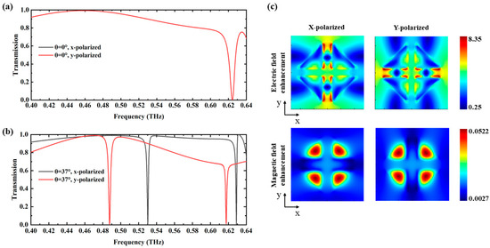 (a) Transmission spectra for x-polarized and y-polarized incident waves at 0°; (b) transmission spectra for x-polarized and y-polarized incident waves at 37°; (c) the electric and magnetic field distribution measured at the surface of the quartz substrate at vertical incidence. The left and right figures correspond to the x-polarized and y-polarized incident wave, respectively.