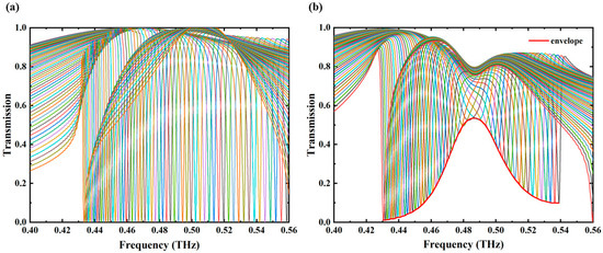(a) Comprehensive transmission spectra without any analyte, with the incident angle ranging from 13° to 70°. Specifically, the rightmost line represents the transmission curve for an angle of 13°, while the leftmost line corresponds to 70°; (b) comprehensive transmission spectra with thick cinnamoylglycine, with the incident angle ranging from 13° to 62°. The corresponding envelope curve has been plotted by red line in the figure.