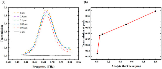 (a) Transmission envelope curves for analytes of varying thicknesses; (b) the relationship between the thickness of the analyte and the transmission at .