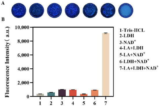 As shown in Figure 2, lactate can only be converted to NADH and produce a visible fluorescent signal when both LDH and NAD+ are present. Figure 2 displays seven sets of fluorescent signals evaluated using a microplate reader on the chip. The fluorescence values measured by the plate reader confirmed that the fluorescence signals generated by each group were consistent with the color intensity observed by the naked eye, indicating that the paper-based platform is suitable for lactate detection. Notably, the fluorescence intensity of the experimental group was approximately 10 times higher than that of the control group samples.