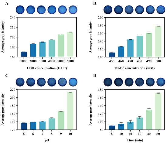 Optimization of the fluorescence assay for the detection of lactate. (A) Optimization of LDH concentration. (B) Optimization of NAD+ concentration. (C) Optimization of buffer pH value. (D) Optimization of reaction time for the detection system. Each group includes fluorescence images taken under various conditions, alongside corresponding histograms showing grayscale signals. All the evaluations were carried out in triplicate (n = 3).