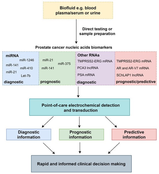 Molecular diagnostic and prognostic testing for PCa has resulted in improved personalised medicine approaches for PCa. Nucleic acids, including DNA and RNA, can provide information on PCa presence, the chance of metastasis and the likelihood of clinical progression [5,6,7,8,9]. The Progensa prostate cancer antigen 3 (PCA3) mRNA assay has previously illustrated that nucleic acid molecular diagnostics can elevate the specificity of testing for PCa [10]. Specifically, the Progensa PCA3 urine test was utilised for PCa patients who had previously had a negative biopsy, to determine if they would require repeat biopsies [10]. However, a thorough economic evaluation of the Progensa PCA3 assay determined that the increase of quality-adjusted life years was not sufficient to accommodate the increased cost within the National Health Service in the United Kingdom [11]. The cell cycle risk (CCR) score (Myriad Genetics), Decipher score (Veracyte) and the genomic prostate score (GPS, Oncotype DX) are all marketed as prognostic mRNA panel tests [7,12,13]. While these tests represent the clinical utility of molecular diagnostics for PCa, each require specialised off-site laboratories and expensive equipment. Point of care (PoC) devices instead present the potential to bring personalised PCa diagnostics and prognostics directly within healthcare spaces. This could result in rapid multipanel testing of relevant biomarkers directly in the clinic, utilising non-specialised personnel.
