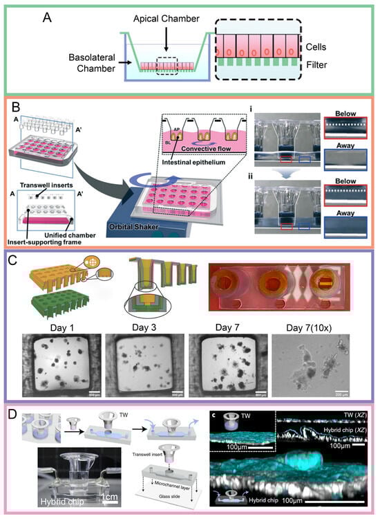 - Shin, W.; Kim, H.J. 3D in vitro morphogenesis of human intestinal epithelium in a gut-on-a-chip or a hybrid chip with a cell culture insert. Nat. Protoc. 2022, 17, 910–939. [Google Scholar] [CrossRef]