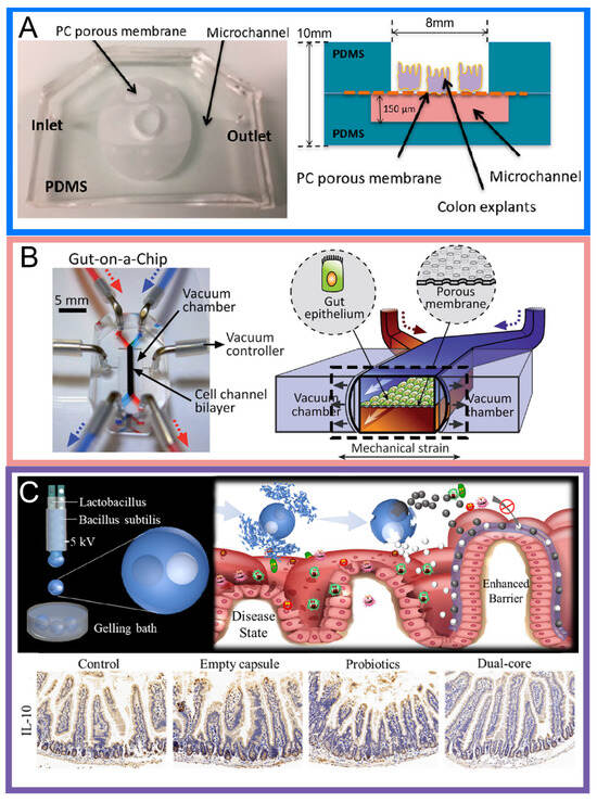 - Kim, H.J.; Li, H.; Collins, J.J.; Ingber, D.E. Contributions of microbiome and mechanical deformation to intestinal bacterial overgrowth and inflammation in a human gut-on-a-chip. Proc. Natl. Acad. Sci. USA 2016, 113, E7–E15. [Google Scholar] [CrossRef] [PubMed]