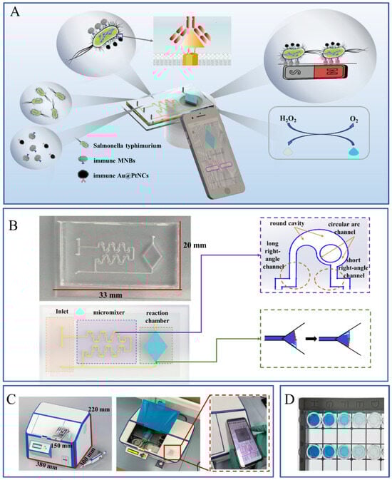 - Jin, N.; Jiang, F.; Yang, F.; Ding, Y.; Liao, M.; Li, Y.; Lin, J. Multiplex nanozymatic biosensing of Salmonella on a finger-actuated microfluidic chip. Lab Chip 2024, 24, 2712–2720. [Google Scholar] [CrossRef] [PubMed]