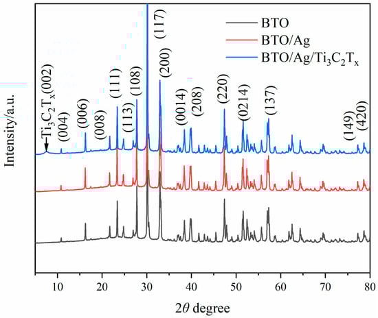 X-ray diffraction patterns of the BTO, BTO/Ag, and BTO/Ag/Ti3C2Tx.