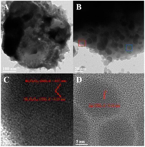 The crystallographic information of the BTO/Ag/Ti3C2Tx is shown in Figure 3. Figure 3A shows an irregular structure, and the enlarged view in Figure 3B reveals a large number of spherical nanoparticles on the surface of BTO, suggesting that the silver nanoparticles have been loaded well onto the surface of BTO. The high-resolution transmission electron microscope (HRTEM) images of BTO in Figure 3C show clear crystalline lattice fringes with lattice spacings of 0.27 nm and 0.19 nm matching well with the (002) and (202) planes of orthorhombic Bi4Ti3O12, respectively [14]. Figure 3D depicts Ag particles of about 10 nm with a clear lattice space of 0.223 nm, aligning with (002) and (202) lattice planes of orthorhombic Bi4Ti3O12 [15]. The use of PEI facilitates better anchoring of Ag on the surface of BTO and helps to maintain the nanoparticle’s good monodispersity.