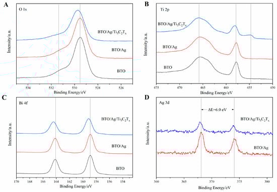 XPS exact spectrum of BTO, BTO/Ag, and BTO/Ag/Ti3C2Tx: (A) is the spectrum of the 1s orbit of O, (B) is the spectrum of the 2p orbit of Ti, (C) is the spectrum of the 4f orbit of Bi, and (D) is the spectrum of the 3d orbit of Ag.