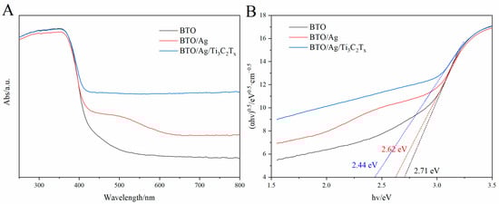 (A) Optical absorption spectra and (B) plot showing the square root of the measured absorption coefficient as a function of the photon energy of BTO, BTO/Ag, and BTO/Ag/Ti3C2Tx.