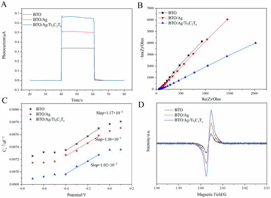 (A) Photocurrent, (B) electrochemical impedance spectroscopy, (C) Mott-Schottky plot, and (D) EPR spectrum of the BTO, BTO/Ag, and BTO/Ag/Ti3C2Tx.