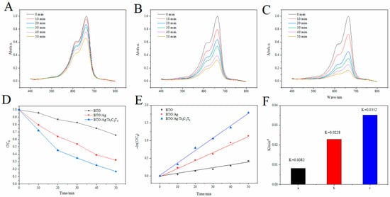 Photocatalytic degradation of MB aqueous solution over the materials: (A–C) UV-vis absorption spectra of the MB solution photodegraded by BTO, BTO/Ag, and BTO/Ag/Ti3C2Tx, respectively; (D) time-dependent degradation curve of MB and (E) its kinetic curve over BTO, BTO/Ag, and BTO/Ag/Ti3C2Tx; (F) first-order reaction rate constants of the MB degradation over the BTO, BTO/Ag, and BTO/Ag/Ti3C2Tx samples.