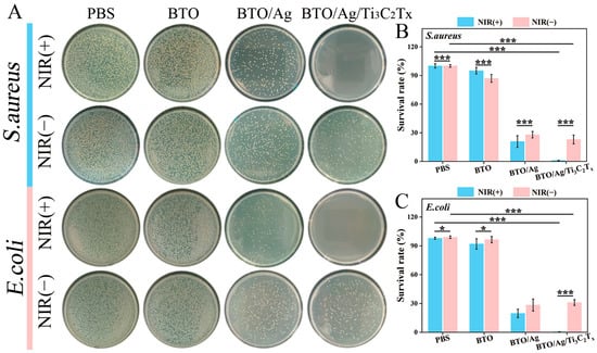 The antibacterial properties of BTO, BTO/Ag, and BTO/Ag/Ti3C2Tx are presented in Figure 8. Escherichia coli (E. coli) and Staphylococcus aureus (S. aureus) were selected as representative groups of Gram-negative and Gram-positive bacteria, respectively. Figure 8 shows the optical photo map of the experimental results (Figure 8A) and the data statistics (Figure 8B,C). As shown in Figure 8A,B, S. aureus and E. coli grow well on Luria-Bertani (LB) agar plates in PBS and even under single near-infrared ray (NIR, 808 nm) irradiation. When incubating bacteria with BTO or BTO/Ag, the bacteria colonies exhibit varying degrees of decline. This indicates that the addition of Ag nanoparticles greatly enhances the antibacterial ability of BTO. Notably, the bacteria survival rate in the BTO/Ag/Ti3C2Tx groups was nearly zero. This indicates that the addition of Ti3C2Tx can better amplify the synergistic effect of BTO and Ag.