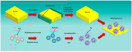 Here, 50 mg of pre-prepared Ti3C2Tx MXene powder was dissolved in deionized water and sonicated for 15 min to achieve an even dispersion. Then, 50 mg of BTO/Ag was added to the mixture and sonicated for another 20 min for well dispersion before 6 h of stirring. The result was washed via centrifugation to obtain the BTO/Ag/Ti3C2Tx complex. Parametric tuning experiments for the Ti3C2Tx content are provided in the Supporting Information.