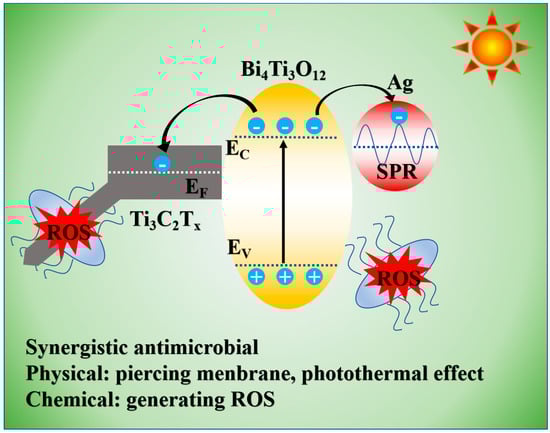 However, the inherent band structure of bismuth titanate materials results in lower visible light absorption, a higher carrier recombination rate, and lower carrier energy state, which limits their application in photocatalysis [4]. Despite these limitations, by loading noble metal nanoparticles on semiconductor materials, its visible light absorption can be optimized. Ag has been extensively studied as a common antimicrobial material. It is reported that nano silver mainly disrupts the synthesis of the cell wall, damages the cell membrane, suppresses the cell protein synthesis, interferes with the synthesis of nucleic acid, and combines with the sulfur-containing hydrogen group (-SH) in bacteria, causing microorganisms to lose activity and eventually die [5]. In addition, Ag can also be used as a photosensitized material to effectively improve the comprehensive performance of photocatalytic materials, showing unique application potential in photocatalysis and other fields. The surface loading of metallic Ag nanoparticles on some semiconductors has been shown to enhance their photocatalytic performance in the visible region. Moreover, the insertion of Ag reduces the recombination rate of charge carriers and improves photocatalytic activity. However, due to limitations in synthesis techniques, only a limited amount of silver nanoparticles can be introduced onto the surface of semiconductor materials [6,7], resulting in margina enhancement in surface catalytic performance, visible light absorption performance, and charge separation performance of the semiconductor material’s active sites. To address this, researchers are exploring the introduction of materials with more abundant surface active sites, stronger visible light absorption ability, and better compatibility with semiconductor materials [8].