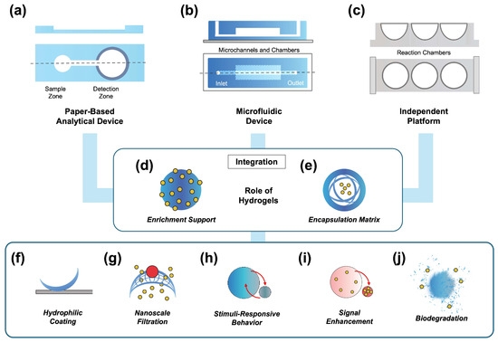 Hydrogel-assisted biosensing platforms for point-of-care use. (a–c) Representative format of POC biosensors: (a) paper-based analytical devices (PAD), (b) microfluidic device, (c) independent platform; (d,e) Role of hydrogels in the system; (f–j) Various functions of the hydrogels in the system.
