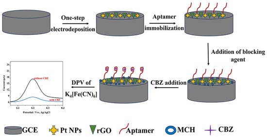 Schematic illustration of the preparation of the electrochemical aptasensor for CBZ detection.