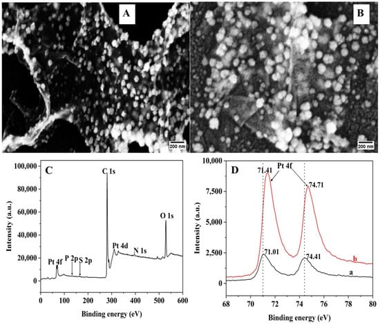 SEM images of (A) Pt-rGO/GCE and (B) Apt-Pt-rGO/GCE. XPS spectra of (C) wide scan of Apt-Pt-rGO/GCE, and (D) Peak binding energy shift of Pt 4f (a) before and (b) after aptamer immobilization.