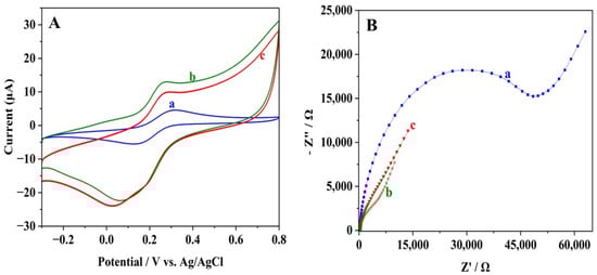 The EIS provides further confirmation of the variations in conductivity between the electrodes. The Pt-rGO/GCE exhibits a smaller half-circle diameter (Figure 3B, curve b) compared to the bare GCE (Figure 3B, curve a), showing lower impedance due to the improved electrical conductivity and larger effective surface area. Therefore, the modification of the GCE with Pt-rGO reduces the Ret to approximately 5000 Ω. However, when the aptamer is immobilized, there is an increase in Ret (~6000 Ω), as shown in Figure 3B (curve c), confirming that the aptamer’s organic and non-conductive nature hinders electron transmission from the redox probe to the electrode.