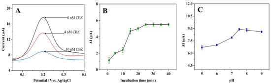 (A) DPVs of 1.0 mM K4[Fe(CN)6] at the aptasensor before and after adding 4 nM and 10 nM of CBZ in pH 7.0 PBS containing 0.1 M KCl. The effects of (B) incubation time (pH fixed at 7.0) and (C) pH (incubation time fixed at 25 min) on the CBZ current response.