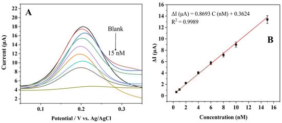 (A) DPV responses of the aptasensor toward CBZ with different concentrations (0, 0.5, 1, 2, 4, 6, 8, 10, and 15 nM) in pH 7.5 PBS containing 1.0 mM K4[Fe(CN)6] and 0.1 M KCl. (B) Linear curve of ΔI vs. CBZ concentration (nM).