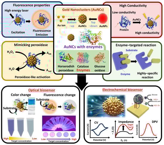 Schematic representation of different approaches of synthetic enzyme–AuNCs and their unique properties that are applicable on optical and electrochemical biosensors.