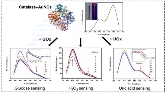 These reactions produce H₂O₂, which quenches the fluorescence of the CAT–AuNCs. Consequently, using the CAT–AuNCs with GOx or UOx, glucose could be detected within a range of 5–500 μM with an LOD of 3 mM, while uric acid could be detected within a range of 10–200 μM with an LOD of 40 nM. From the comparison of the efficiency of the CAT–AuNCs with other materials, such as AuNPs, BSA–AuNCs, and carbon quantum dots (CQDs), the CAT–AuNC-based sensors showed good results. The author claimed that the results could be attributed to both the activity of the CAT and dual-emission fluorescence characteristics of the CAT–AuNCs.