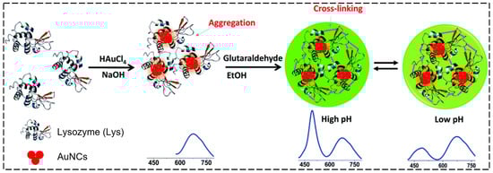 Taking advantage of Lys–AuNCs, Chandirasekar et al. suggested and then developed lysozyme nanoparticle-encapsulated AuNCs (LysNP–AuNCs) for use as a ratiometric pH sensor based on the covalent cross-linking of the Lys–AuNCs (Figure 5) [96]. The AuNCs in the LysNP–AuNCs were found to be strongly embedded into the LysNPs, protecting the fluorescence of the AuNCs from photobleaching and under high salt concentrations more adequately than Lys–AuNCs, which enabled specific pH sensing. They determined the LysNPs to be pH responsive given that the green fluorescence of the LysNPs gradually decreased as the pH was changed from 9.5 to 7.5. This is because the α-helical structure of the LysNPs was gradually changed upon increasing the pH of the solution. In contrast, the red fluorescence of the AuNCs was insensitive to changes in the pH. This difference occurs in the variation of the two fluorescence emissions, and when the green and red channel images were overlapped, the merged images appeared orange, yellow, and bright yellow at a pH of 7.0, 8.0, and 9.0, respectively. The pH-induced change in the fluorescence of the LysNPs enabled the use of LysNP–AuNCs to ratiometrically detect slight changes (to 0.2 pH units) in the pH range from 7.5 to 9.5. Additionally, the LysNP–AuNCs were well suited to probing enzymatic reaction-induced changes in the pH, as exemplified in the context of urease-mediated hydrolysis of urea. Moreover, the LysNP–AuNCs were applicable to the detection of changes in the pH inside HeLa cells and provided great potential for monitoring mitochondrial pH levels (pH = ~8.0) and intracellular changes in the pH after treatment with cancer drugs.