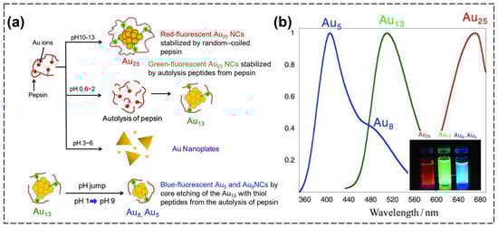 (a) Schematic illustration of the pH-dependent synthesis of Peps–AuNCs. (b) Fluorescence spectra of synthesized Peps–AuNCs with red (Au25 at a pH of 12), green (Au13 at a pH of 1), and blue fluorescence (Au5 and Au8 at a pH of 9). Inset image: Peps–AuNCs with red, green, and blue emissions under UV light [99].