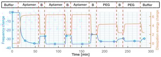 QCM-D measurements show the change of frequency in blue, and dissipation energy in orange. The aptamer solution flowed into the chamber in a 30 min window and was then cleaned with a buffer for 10 min. This procedure was repeated three times. For the PEG solution, two of these procedures were conducted. No change after the first buffer cleaning was observed for either. B stands for Buffer.