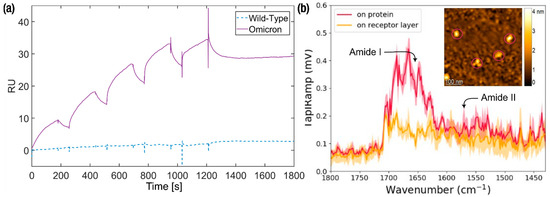 To confirm the binding of the C9t aptamer/PEG receptor layer to the Omicron S protein of the SARS-CoV-2 virus, AFM-IR investigations were performed. This technique provides the capability of characterizing the composition of the sample by both topographic and spectroscopic properties on the level of individual molecules [43]. The binding of protein to the receptor layer was resolved by tapping AFM-IR (Figure 2b). The inset of Figure 2b represents the topography image recorded after protein incubation. Globular features with an average height of approx. 4 nm were observed. To identify the chemical composition of features on the surface, nano-IR point spectra were recorded on the four objects (pink circles) and four points next to them on the functionalized gold surface. In the spectra recorded of the high features, slightly increased absorbance appears at 1520–1560 cm−1 together with a significantly stronger band between 1607–1710 cm−1. Together these bands can be assigned to amide II and amide I bands of the attached protein [50]. The amide bands are absent in the spectra recorded of the surface next to the topographic features, which was presumably the receptor layer. Therefore, the circled features are proven complexes of the S protein and the C9t aptamer (Figure 2b). These preliminary findings are further substantiated in a detailed investigation by AFM-IR experiments to elucidate the structural and functional relation of the receptor layer and the S protein [51].