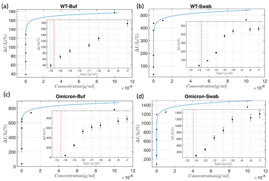 Calibration curves. The calibration curves represent the response of the aptasensor in a concentration ranging from 1 fg/mL to 100 ng/mL of the target proteins: against (a) wild-type S protein of the SARS-CoV-2 virus in ferri/ferrocyanide solution and (b) wild-type S protein of the SARS-CoV-2 in a spiked negative control (non-infectious) nasal swab, (c) the S protein of the Omicron variant in ferri/ferrocyanide solution, and (d) the S protein of the Omicron variant in a spiked negative (non-infectious) control nasal swab. The overlay figure shows the Langmuir–Freundlich curve representation of the biosensor’s response without logarithmic axis modifications, whilst the inset shows the logarithmic representation of the obtained data, and the dashed line represents the LoD for the individual media–analyte combination. Hereby, all calibration curves were determined at 16 individual electrodes per chip, for three chips per condition.