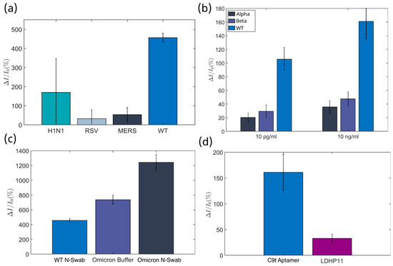 The selectivity of an aptasensor was further evaluated against variants of the S protein of the SARS-CoV-2 virus. Using a concentration of 10 ng/mL, a response for the S protein of the wild-type variant resulted in in the buffer solution, and in the negative nasopharyngeal swab. The highest response was measured against the S protein of the Omicron variant with in buffer solution and in the negative nasopharyngeal swab (Figure 4c). The widespread alpha and beta variants were evaluated with their S proteins in a buffer solution, and a low response was found compared to the response against the S protein wild-type variant. In the case of the S protein of the alpha variant, the response was and with 85% and 78% smaller signals for 10 pg/mL and 10 ng/mL, respectively. Furthermore, for the S protein of the beta variant, the responses and were 79% and 70% smaller (Figure 4b). Additionally, control experiments demonstrated that a specific aptamer sequence of C9t obtained 4.8 times higher signals for Wildtype S protein detection and 24.5 times higher signals for Omicron S protein detection than the LDHp11 aptamer used as control and previously reported for the detection of a malaria biomarker (Figure 4d) [27].