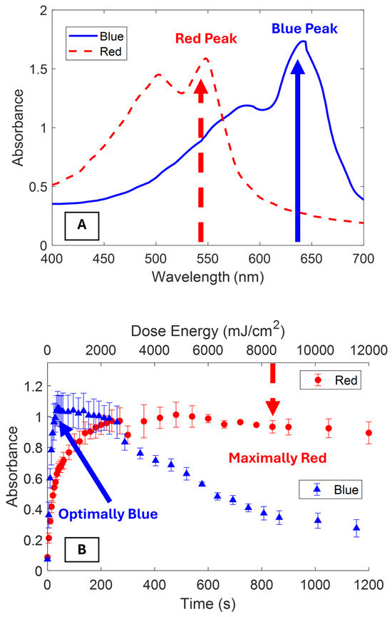 Designing effective polydiacetylene sensors requires careful optimization. The goal is to maximize blue phase polymer content while minimizing driving the blue phase into the red phase. The polymerization properties of polydiacetylene vesicles can be characterized by measuring the evolution of the blue (~640 nm) to red phase (~550 nm) with increasing UV dose. Figure 2A shows the absorbance spectra of optimally blue and maximally red PDA vesicles. The blue phase has a primary excitonic peak centered around 640 nm and a vibronic satellite peak around 580 nm. When driven completely into the red phase, the absorption spectrum blue shifts with the excitonic peak at approximately 550 nm and the vibronic peaks at 500 nm. The blue shift is consistent with other reports on the optical properties of polydiacetylene vesicles [4,22,25]. The deconvolution of the primary peaks and additional satellite peaks for the blue and red phases of PCDA can be found in the Supplementary Materials (Figures S7 and S8) along with a table of the relevant peak parameters (Table S1). Figure 2B shows the evolution of the peak blue and red phases as a function of UV dose. The blue phase rapidly increased until reaching a plateau and then slowly transitioned into the red phase. The red phase increased until it reached an asymptotic value. At this plateau, all of the monomer has polymerized and transformed to the red phase. As not all PDAs in the vesicles are aligned for polymerization, the complete polymerization of a sample is not possible. The UV dose energy for optimally blue polymerization was taken as the inflection point of the blue phase where growth was stalled and red phase conversion became dominant over monomer polymerization. The peak red phase was the asymptotic value consistent with the blue phase decaying towards its asymptotic value.