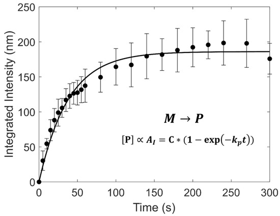 Integrated Intensity as a function of polymerization time for PCDA vesicles fit to a first-order model (R2 = 0.92). The fit line is for a first-order polymerization reaction of monomer [M] to polymer [P]. Fitted parameters are listed in Table 4. The UV dose was 9.6 ± 0.9 mW/cm2.