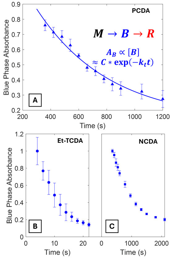 Diacetylene polymerization kinetics are typically much faster than the polydiacetylene blue to red phase transition kinetics. In this case, a two-step reaction model is used (). The red phase transition rate can be extrapolated by fitting the decay of the blue phase at long timescales to a first-order exponential decay model. Figure 4A shows the blue phase absorbance decay of PCDA vesicles. Figure 4B,C shows two additional PDA vesicle solutions (Et-TCDA and NCDA) with dramatically different decay timescales. Data for other PDA vesicles is provided in the Supplementary Materials (Figure S11).