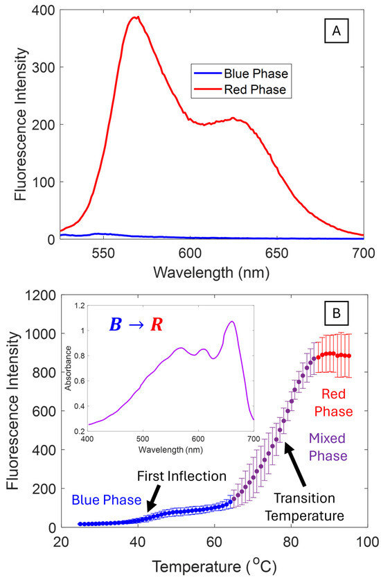 (A) Fluorescence spectrum of PCDA blue and red phases. (B) Thermal fluorescence curve of PCDA that shows three regions: a blue phase region, a mixed region where the blue phase begins to transform to red, and a plateau region where the system is completely driven into the red phase. Inset is a UV-vis spectra showing the colorimetric properties of the “mixed phase” where there is a mixture of blue and red phases, yielding a purple color.