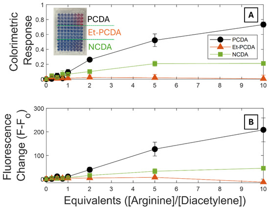 Since the 1990s, biosensing with polydiacetylenes has primarily been based on receptor–ligand interactions (Table 1). Fatty acid polydiacetylenes have carboxylic acid headgroups which are typically anionic in most physiological aqueous conditions. Due to this negative charge, they have been demonstrated to have transition sensitivity to positively charged amino acids like arginine and lysine without the need for functionalization [63]. Figure 6 shows both a colorimetric response curve (Figure 6A) and fluorescence change curve (Figure 6B) for PCDA, Et-PCDA, and NCDA vesicles exposed to different ratios of arginine. The colorimetric response () measures the decay in the percent blue phase (PB) with an applied stimulus. The fluorescence response (FR) is simply the difference in fluorescence between the initial and final states. PCDA showed a distinct increase in and with exposure to increasing concentrations of arginine up to 10 equivalents. NCDA also exhibited a small increase in both and upon exposure to arginine, though lower in magnitude in comparison to PCDA. This is consistent with the increased van der Waals forces between the tails, and therefore, energy required for the transformation of NCDA. Et-PCDA did not transform upon exposure to arginine, even though both photochromism and thermochromism studies showed Et-PCDA to be more sensitive than PCDA. It can be concluded that the ethanolamine headgroup prevents the adsorption of positively charged amino acids. This points to the important role of multiplexing various PDA vesicles to distinguish between different analytes when designing robust PDA sensing systems.