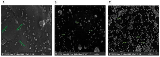 SEM images of (A) AuNP, (B) COC-AuNP, and (C) MET-AuNP.