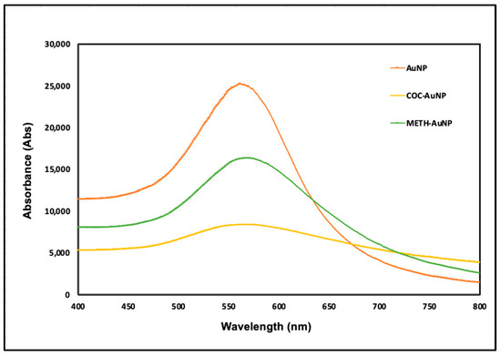 Since AuNPs have a maximum absorbance peak between 540 and 570 nm wavelength, the binding of COC and MET aptamers to the AuNP surface resulted in a decrease in the maximum absorbance peak (Figure 2). The decrease in the peak level confirmed the successful binding of the aptamers to the surface of the AuNPs.