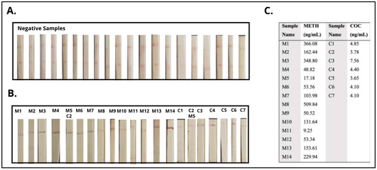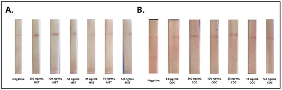 In the literature, the range of detectable concentrations of COC in saliva after cigarette ingestion was reported as 15.85–504.88 ng/mL as well as the range of detection in saliva after intravenous ingestion was 428–1927 ng/mL [5]. Positive responses were obtained from 1.0 µg/mL concentration to 5.0 ng/mL when COC standard solutions were applied. The oral fluid cut-off values for COC determined by organizations such as SAMHSA, DRUID, and Talloires are 8.0 ng/mL, 10 ng/mL and 10 ng/mL, respectively [13]. As seen in Figure 3, the cut-off value is 5.0 ng/mL in the strips we prepared. In a study conducted on the amounts of MET in saliva, MET concentrations varying according to dose intake and residence time in saliva were generally between 2.5–200 ng/mL [3]. Strips prepared for MET showed positive responses between 5.0 ng/mL and 200 ng/mL. Oral fluid cut-off values for MET determined by organizations such as SAMHSA, DRUID, and Talloires are 50 ng/mL, 25 ng/mL, and 20 ng/mL, respectively [13]. The cut-off value for the prepared MET strip was determined as 5.0 ng/mL. The results are shown in Figure 3A,B. Test responses clearly formed within 10 min and no false positives or false negatives were observed up to an hour.